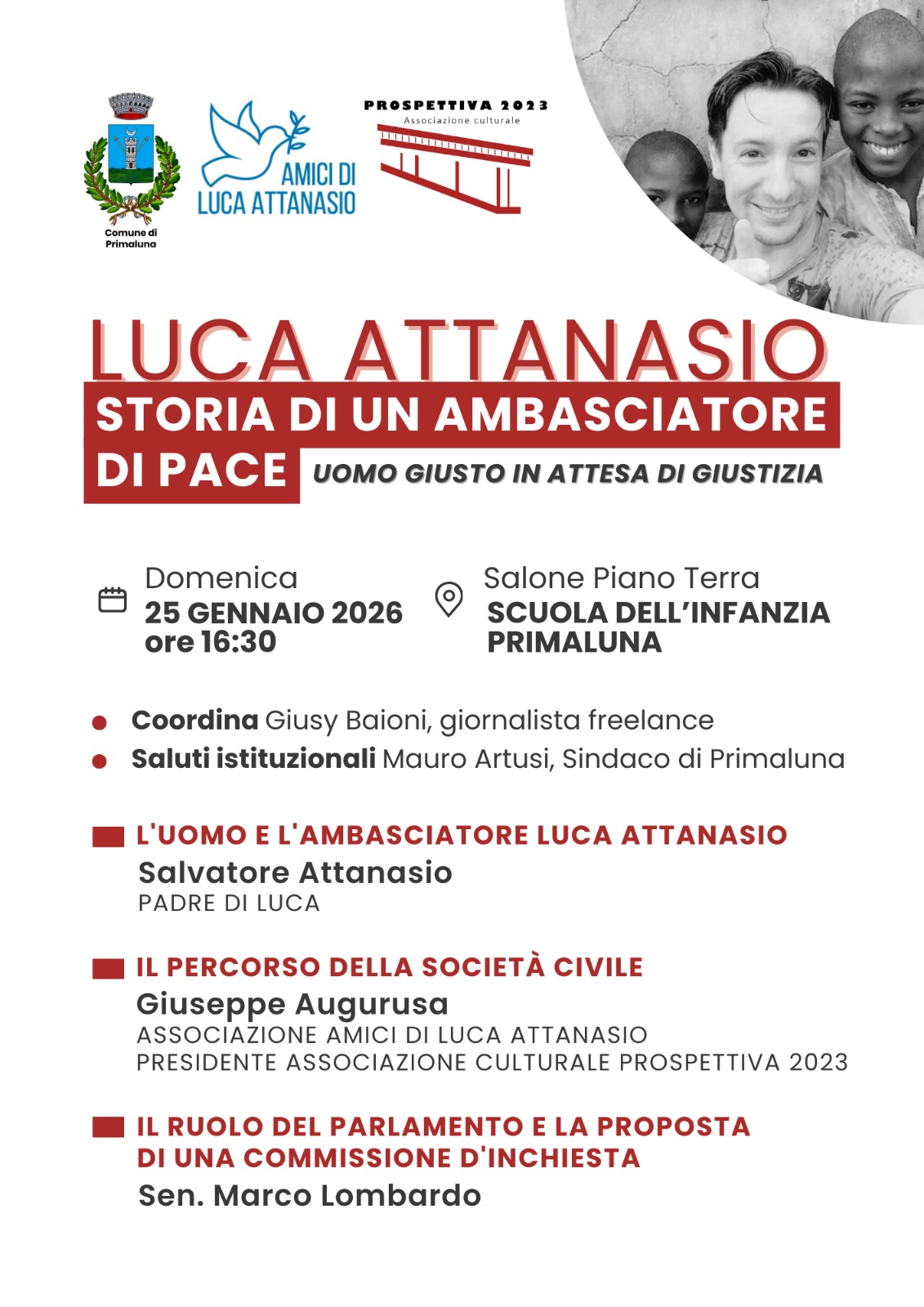Nella giornata di domenica 25 gennaio presso il salone della Scuola dell'Infanzia di Primaluna, si terrà un evento per ricordare la figura dell'Ambasciatore Luca Attanasio, tragicamente ucciso il 22 febbraio 2021 in un agguato nella Repubblica del Congo insieme al Carabiniere Scelto Vittorio Iacovacci e il Sig. Mustapha Milambo.
